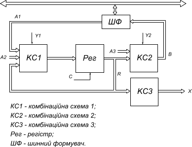 - КС2 – комбінаційна схема 2, що виконуватиме МО, що націлені на формування вихідної шини В, вхідними данними є вхадне слово А3 та значення регістра;