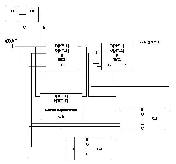 лічильник С3, що забезпечує скид регістра RG2, якщо на виході Q лічильника С2 протягом заданого інтервалу часу не формується сигнал логічної 1,N" -розрядні регістри пам'яті RG1 і RG2,N" -розрядна схема порівняння.