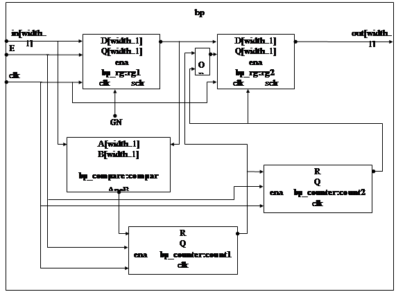 Структурна схема HDL-моделі блоку пам’яті bp приведена на рис.3. Результати моделювання компонентів bp_rg, bp_compare, bp_counter приведені на рис 4 - 6.