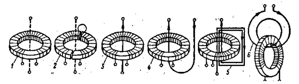 Многовитковые трансформаторы тока (рис. 1) изготовляются с катушечной первичной обмоткой надеваемой на магнитопровод; с петлевой первичной обмоткой 5, состоящей из нескольких витков; со звеньевой первичной обмоткой, выполненной таким образом, что внутренняя изоляция трансформатора тока конструктивно распределена между первичной и вторичной обмотками, а взаимное расположение обмоток напоминает звенья цепи; с рымовидной первичной обмоткой, выполненной таким образом, что внутренняя изоляция трансформатора тока нанесена в основном только на первичную обмотку, имеющую форму рыма.