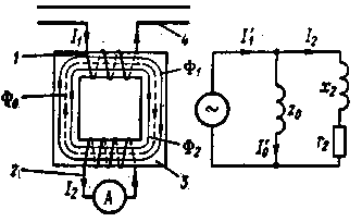 Принципиальная схема одноступенчатого электромагнитного трансформатора тока и его схема замещения приведены на рис. 2. Как видно из схемы, основными элементами трансформатора тока участвующими в преобразовании тока, являются первичная 1 и вторичная 2 обмотки, намотанные на один и тот же магнитопровод 3. Первичная обмотка включается последовательно (в рассечку токопровода высокого напряжения 4, т. е. обтекается током линии Ij . Ко вторичной обмотке подключаются измерительные приборы (амперметр, токовая обмотка счетчика) или реле. При работе трансформатора тока вторичная обмотка всегда замкнута на нагрузку.