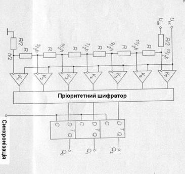 Якщо прикладена вхідна напруга не виходить за межі діапазону від 5h/2 до 7h/2, деh = Uоп/7 – квант вхідної напруги, що відповідає одиниці молодшого розряду АЦП, то компаратори з 1-го по 3-й встановлюються у стан „1”, а компаратори з 4-го по 7-й – у стан „0”. Перетворення цієї групи кодів у 3-значне двійкове число виконує логічний пристрій, що називається пріоритетним шифратором.