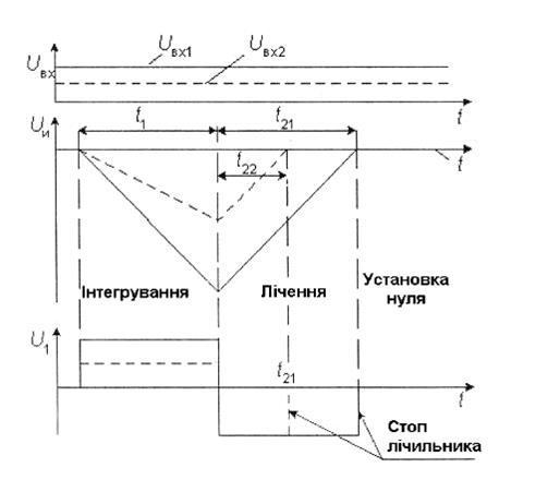 Стадія лічення закінчується, коли вихідна напруга інтегратора переходить через нуль. При цьому компаратор К перемикається і лічення зупиняється. Інтервал часу, на якому іде стадія лікування, визначається рівнянням: