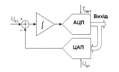 Робота цієї схеми заснована на відніманні з вхідного сигналу Uвх(t) величини сигналу на виході ЦАП, що здійснена а попередньому такті роботи схеми. Одержана різниця інтегрується, а потім перетворюється у код паралельним АЦП невеликої розрядності. Послідовність кодів поступає на цифровий фільтр нижніх частот.