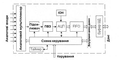 Зараз розповсюджені АЦП, де дані сприймаються з багатьох джерел. Такі АЦП називаються системами збирання даних (dataacquisitionsystem) або мікроконверторами. Функціональна схема мікроконвертора наведена на рис.17.