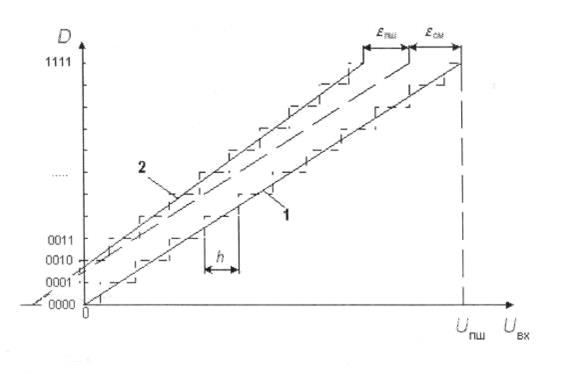 У відсутності апаратних погрішностей середні точки ступенів розташовані на ідеальній прямій 1, якій відповідає ідеальна характеристика перетворення. Реальна характеристика може суттєво відрізнятись від ідеальної розмірами та формою ступенів, а також Ії розміщенням на площині координат. Для кількісного опису цих відмінностей є цілий ряд параметрів.