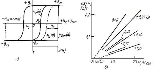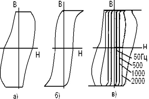 На рисунку 1.8 наведено приклади петель гістерезису для одного і того ж осердя, але при синусоїдальній формі індукції (а) і при синусоїдальній формі напруженості (б). Малюнок 1.9 (в) показує розширення динамічної петлі гістерезису залізо нікелевого сплаву, що володіє прямокутною петлею гістерезису, при зростанні частоти перемагнічування.