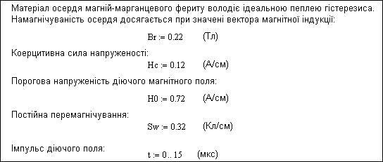 На основі проведеного розрахунку геометричної форми осердя із прямокутною петлею гістерезису при імпульсному діянні в математичному пакеті MathCAD, вихідними даними являються: