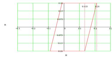 Враховуючи, що матеріал осердя володіє ідеальною петлею гістерезису, тому в початковому стані осердя приймає значення магнітної індукції – 0,22 Тл. Перемагнічування осердя досягається при імпульсному діянні генератора прямокутних імпульсів, створюючи діюче поле, яке обумовлене зміною магнітної індукції.