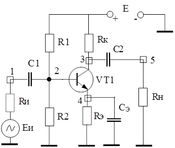 · напряжений в точках 1, 2, 3, 4, 5 при подаче на вход усилителя напряжения источника сигнала и наличии напряжения питания;