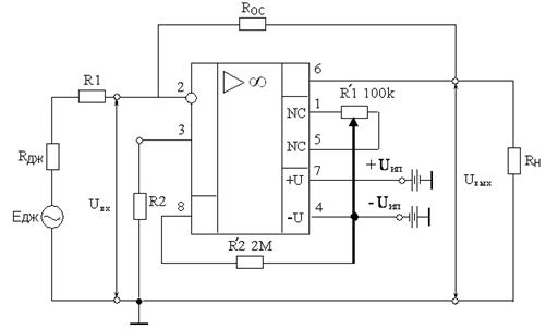 Рассчитать инвертирующий и неинвертирующий усилители на операционном усилителе (ОУ). Схема должна содержать цепи частотной коррекции и балансировки нуля.