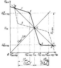 ) уровни логических сигналов находятся как точки пересечения АПХ (кривая 1) с ее зеркальным отображением (кривая 2) относительно прямой единичного усиления UВЫХ