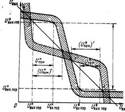 Реализация характеристик, близких к идеальным, связана с известными трудностями вследствие технологического разброса параметров микросхем при изготовлении, изменения пороговых напряжений в зависимости от изменения напряжения питания и температуры окружающей среды в процессе эксплуатации. Поэтому реально зоны статической помехоустойчивости для каждого типа ЛЭ устанавливают на основании статистического анализа амплитудных передаточных характеристик. На рис. 2.2 заштрихованная область соответствует возможным разбросам амплитудных передаточных характеристик ЛЭ одного типа.