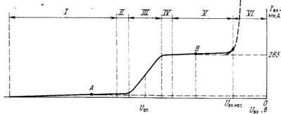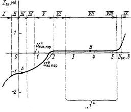 На входной характеристике ЛЭ ТТЛ (см. рис. 2.4) можно выделить следующие зоны: I, IX — зоны недопустимых входных напряжений; II.VIII— зоны предельно допустимых входных напряжений, оговоренных в технических условиях; III, VII — зоны, определяющие рабочий режим ЛЭ; наиболее характерный режим при напряжении низкого уровня («0») — точка А, при напряжении верхнего уровня — точка В; IV, VI — зоны допустимых статических помех; V — зона переключения.