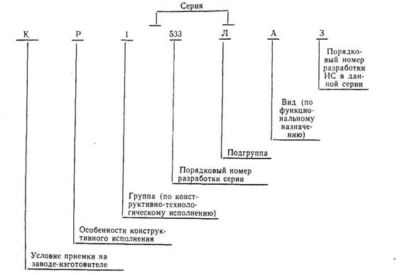 По принятой системе ГОСТ 17021—75 обозначение ИС должно состоять из четырех элементов. Первый — цифра (1, 5, 7), обозначающая конструктивно-технологическое исполнение ИС; второй — цифры, обозначающие порядковый номер серии микросхемы от 000 до 999 либо от 00 до 99. Первые два элемента определяют номер серии ИС. Третий элемент — две буквы, соответствующие подгруппе и виду по функциональному назначению, четвертый — порядковый номер ИС по функциональному признаку в данной серии. Буквы К, KM, KP перед условным обозначением микросхем характеризуют условия их приемки на заводе-изготовителе и особенности конструктивного исполнения. Иногда в конце условного обозначения добавляется буква, определяющая технологический разброс электрических параметров данного типономинала.