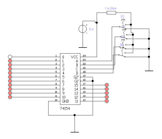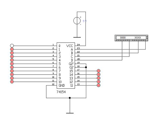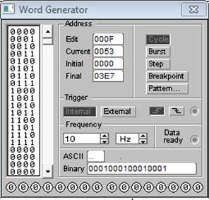 3. Подключить к адресным входам дешифратора генератор слова и настроить его выходные комбинации таким образом, чтобы обеспечить поочередное зажигание светоиндикаторов на выходе дешифратора, начиная с 0 (обеспечить режим работы «бегущий огонь»).