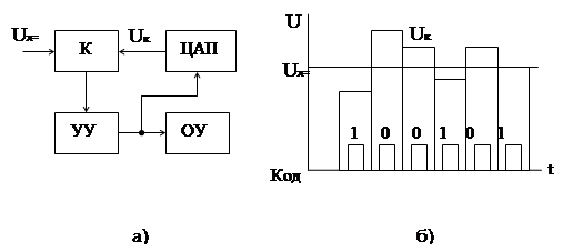 Рисунок 3 – Структурная схема (а) и временная диаграмма (б), поясняющая работу кодо-импульсного ЦВ поразрядного уравновешивания