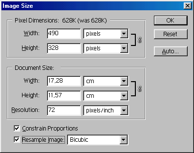 При подготовке изображений для Web нам важны лишь размеры изображения в пикселях, поэтому работа происходит только с верхними полями окна Размер изображения. При подготовке изображений для печати мы работаем с полями размер документа в сантиметрах и полем разрешение, но при этом следим, чтобы значение ширины и высоты в пикселях не изменялось слишком сильно. Обратите внимание, что увеличение или уменьшение размеров происходит пропорционально, так как в окне Размер изображения помечен соответствующий пункт.