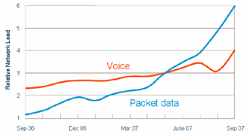 Пакетный трафик передачи данных начал опережать трафик передачи голоса уже в мае 2007 в среднестатистических сетях 3G (WCDMA), см. рисунок 2. Основная причина того, что это стало реальностью, появление на сетях поддержки HSPA. Карточки беспроводных модемов HSPA и USB-донглы обрели популярность. Некоторые операторы отмечают четырехкратный прирост трафика передачи данных в течение всего трех месяцев с момента запуска HSPA.