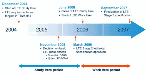 Исходной точкой для стандартизации LTE стала рабочая встреча 3GPP RAN Evolution Workshop, проведенная в ноябре 2004 года в Торонто, Канада. В декабре 2004 года начались исследования, целью которых было выработать временные рамки эволюции технологии радиодоступа 3GPP: