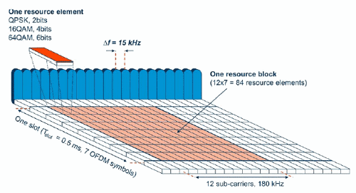 Символы OFDM сгруппированы в ресурсные блоки. Ресурсные блоки имеют размер в 180 кГц в частотном измерении и 0.5 мс во временном измерении. Каждый временной интервал передачи (TTI, Transmission Time Interval) состоит из двух слотов (Tslot).