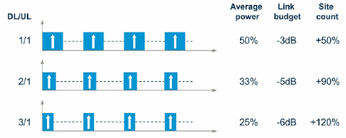 Более того, операторы зачастую хотели бы выделить более, чем половину своих ресурсов для организации канала вниз (чтобы повысить пиковую скорость в этом направлении). Если соотношение DL/UL равно 3:1, то для реализации сети TDD потребуется на 120% больше сайтов, нежели для реализации сети FDD.