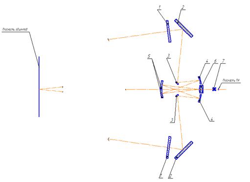 - Сферические зеркала 4 и 5, (наклонные плоские и сферические зеркала служат для увеличения оптического пути с целью сопряжения входного и выходного зрачков)
