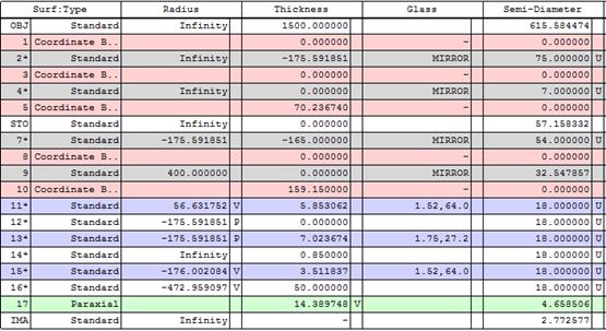 На рисунке 5 в таблице представлены значения конструктивных элементов оптической системы – радиусы кривизны, толщины, световые диаметры, показатели преломления стекол.