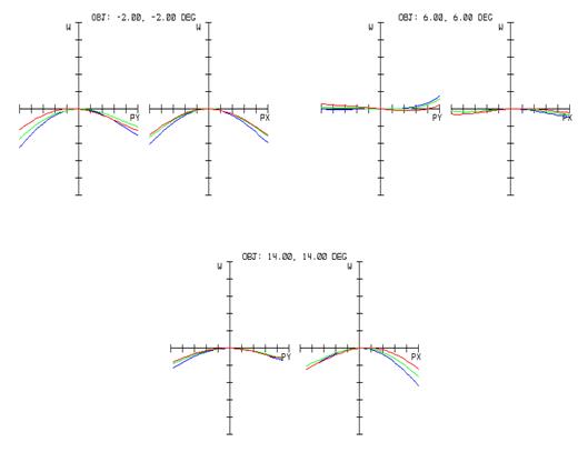 На рис. 7 представлены графики поперечных и волновых аберраций оптической системы. Как видно, полностью избавить систему от аберраций не удалось, в частности наибольшую проблему представляет хроматизм увеличения. Но в целом, результаты можно признать приемлемыми.