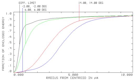 Главным критерием аберрационного расчета является вписывание пятна рассеяния в размер элемента матрицы. На графике изображено геометрическое распределение энергии в зависимости от радиуса кружка. Пятно рассеяния определяется по уровню энергии 0,7. По графику радиус кружка рассеяния составляет около 5 мм. Результаты можно считать приемлемыми.