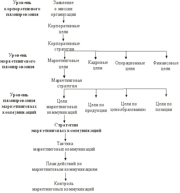 В виде пояснения к схеме, можно отметить, что корпоративный уровень планирования обычно распространяется на пять лет вперед, маркетинговое планирование учитывает два или три года, а планирование маркетинговых коммуникаций, как правило, осуществляется на период, продолжительностью один год или в зависимости от целей фирмы и проектов.