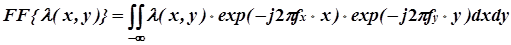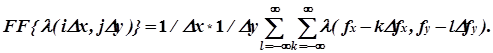 Преобразование Фурье (спектр) дискретизованной двумерной функции FF{λ(iDx,jDy) } получается периодическим продолжением спектра исходной непрерывной функции λ (x,y) в точки частотной плоскости (kDfx,lDfy) (рис.5), где fxи fy - так называемые "пространственные частоты", являющиеся аналогами обычной "временной" частоты и отражающие скорость изменения двумерной функции λ (x,y) по соответствующим координатам (крупные фрагменты изображения - низкие частоты, мелкие детали - высокие частоты).