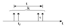Это неординарный (групповой) пуассоновский поток. События – моменты вызовов , представляют собой простейший пуассоновский поток с параметром λ . В каждый момент времени ti с вероятностью pl поступает группа из l ( l = 1,2 ,…r ) одинаковых заявок. Величинаl – характеристика неординарности. Обозначим параметр al = λpl . Вероятность поступления k требований в промежутке времени длиной t :