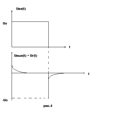 В качестве примера, иллюстрирующего дифференцирование и интегрирование сигналов, рассмотрим отклик RC-цепей, показанных на рис.2 и 3, на прямоугольный импульс. Возьмём цепь, на выходе которой стоит сопротивление (рис.2), найдём осциллограмму выходного напряжения, т.е. вид UR (t). Пусть в момент времени t = 0 на входе возникает скачок напряжения U0 (рис.4).