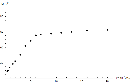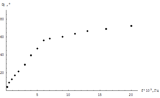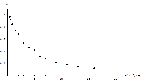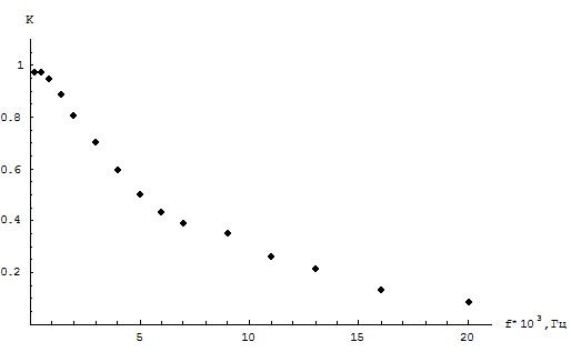 | f,Гц*103 | 0,2 | 0,5 | 0,9 | 1,4 | 2 | 3 | 4 | 5 | 6 | 7 | 9 | 11 | 13 | 16 | 20 |