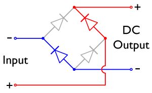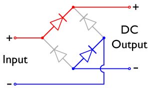 Диодный выпрямитель или диодный мост (то есть 4 диода для однофазной схемы (6 для трёхфазной полумостовой схемы или 12 для трёхфазной полномостовой схемы), соединённых между собой по схеме) — основной компонент блоков питания практически всех электронных устройств.