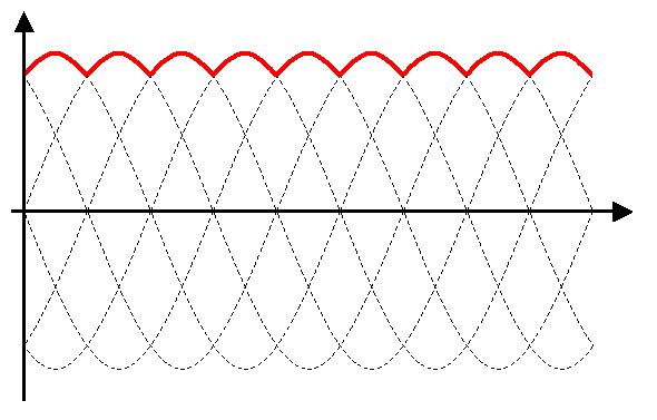 В схеме трехфазного выпрямительного моста в результате получается напряжение на выходе с меньшими пульсациями, чем в однофазном выпрямителе (рис.3).