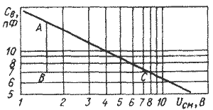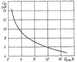 Зависимость емкости р-n перехода от приложенного к нему обратного напряжения имеет степенной характер вида С=U-n , где значение параметра n может находиться в пределах от 0,33 до 0,5 (определяется технологией изготовления перехода). На рис. 10 показана типовая вольт-фарадная характеристика варикапа Д902, построенная в линейных координатах. Подобные характеристики можно найти в справочной литературе. Они позволяют определить емкость варикапа при различных значениях напряжения смещения.