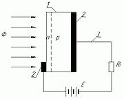Рисунок 14. Структурная схема фотодиода. 1 — кристалл полупроводника; 2 — контакты; 3 — выводы; Ф — поток электромагнитного излучения; Е — источник постоянного тока; RH — нагрузка.