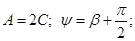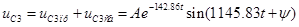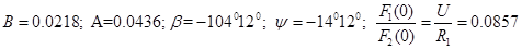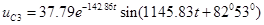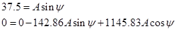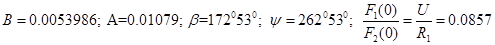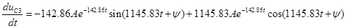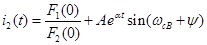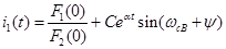 Определим постоянные интегрирования, для этого составим систему уравнений. Первое уравнение системы – это уравнение искомой величины. Оно записывается в виде суммы принужденной и свободной составляющих. Принужденная составляющая найдена выше. Свободная составляющая записывается в соответствии с видом корней характеристического уравнения. При двух комплексных сопряженных корнях свободная составляющая представляет собой затухающую синусоиду, которая содержит две постоянных интегрирования А и