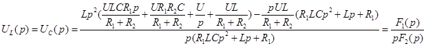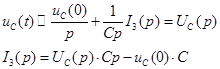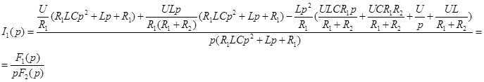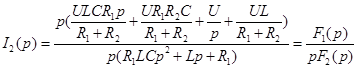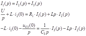 2) Находится изображение искомого тока. Операторная схема замещения содержит 3 источника в разных ветвях: основной и два дополнительных. Поэтому для нахождения изображения тока второй ветви воспользуемся законами Кирхгофа в операторной форме:
