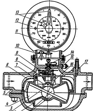 Показания прибора регулируют перепуском части жидкости непосредственно из входного патрубка в выходной регулировочным винтом 17. Весь механизм счетчика размещается в корпусе 5. Смазка трущихся деталей механизма осуществляется с помощью масленки 15. Вследствие неразрывности потока измеряемой жидкости дисковый поршень непрерывно колеблется. При каждом полном колебании диска через измерительную камеру прибора протекает определенная порция жидкости, теоретически равная объему камеры за вычетом объема диска с шаровой опорой и объема радиальной перегородки.