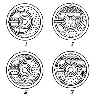 Принцип действия прибора иллюстрирует рис.4, на котором изображены четыре положения кольцевого поршня. Жидкость поступает то во внешнее пространство между Поршнем и стенкой измерительной камеры, то во внутреннее пространство между поршнем и внутренними цилиндрическими выступами. Из-за этого то на внешней, то на внутренней поверхностях поршня появляется избыточное давление, под действием которого поршень совершает сложное планетарное движение. За полный цикл движения поршня через счетчик протекает количество жидкости, теоретически равное объему измерительной камеры.