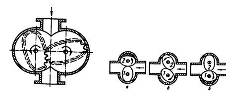 Принцип действия счетчиков данного типа показан на рис. В первом положении (рис. 6, а) разность давлений во входной и выходной частях камеры, действуя на обе шестерни, создает момент лишь на шестерне 2, поворачивающий ее против часовой стрелки. На плечи же (относительно оси ее вращения) шестерни 1 действуют одинаковые усилия от разности давлений. Таким образом, в этом положении шестерня 2, вращаясь под действием момента, приводит во вращение и шестерню 1. Во втором положении (рис. 6, б) на обе шестерни действуют вращающие моменты, однако абсолютное значение каждого из них меньше, чем момент, действующий на шестерню 2 в первом положении. Это объясняется тем, что из-за частичного перекрытия шестерен появляется обратный момент со стороны давления в выходном патрубке. И, наконец, в третьем положении (рис. 6, в) вращающий момент действует лишь на шестерню 1. По абсолютному значению этот момент равен моменту, действующему на шестерню 2 в первом положении, но направлен по часовой стрелке. В данном случае шестерня ведет шестерню 2.