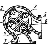 Счетчики лопастные (камерные) ротационные (рис. 7). Корпус 5 соединен с двумя патрубками для подвода и отвода измеряемой жидкости, расположенными под углом 90°. Внутри цилиндрической полости корпуса помещен ротор б с четырьмя полукруглыми пазами, в которых расположены четыре лопатки 1-4, выполненные в форме корытца. К торцам ротора крепятся две дисковые пластины с подшипниками для осей лопаток. Специальная система шестеренок, установленных между одной из торцовых пластин и задней крышкой камеры, обеспечивает неизменный наклон лопаток относительно горизонтальной оси счетчика.