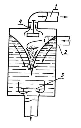 Схема центробежного фильтра-газоотделителя показана на рис. 10. Поток бензина подается в газоотделитель через радиальный трубопровод 2 по касательной к установленной в камере газоотделителя конусной перегородке. Вследствие этого столб бензина в камере приобретает винтообразное движение. Под действием центробежной силы более тяжелые частицы жидкости как бы отбрасываются к стенкам камеры, а легкие пузырьки воздуха группируется в центре и через отверстие в перегородке поступают к клапану 4. Этот клапан регулирует выходное отверстие для сброса воздуха в отводной трубопровод 1 в зависимости от давления