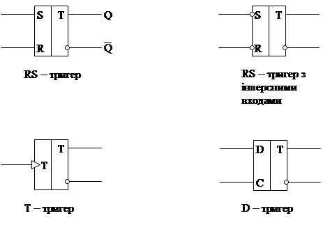 Умовні позначення розглянутих видів тригерів зображені на мал. 1., де призначення входів слідуюче: