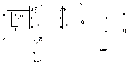 Призначений для запису інформації поступаючої на вход D. Ця інформація записується в тригер під час дії синхронізуючого імпульсу, поступаючого на вхід С, а на виході тригера воно з'являється тільки після його закінчення. D – тригер виконаний на двух синхронізуючих RS – тригерах.