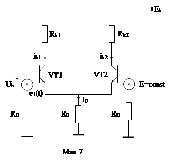 При е1 (t)=Е обидва транзистора відкриті, у кожному з плеч протікає струм 0,5I0 , а напруги на участках Б-Э транзисторів обох плечей схеми однакові і рівні: Uбэ1 =Uбэ2 =Е-I0 Rэ .