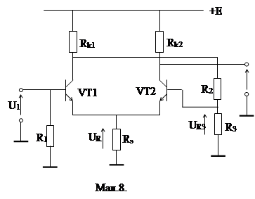 В основі тригера Шмідта покладено розглянутий вище перемикач струму. Один з варіантів його схеми зображений на "8.: